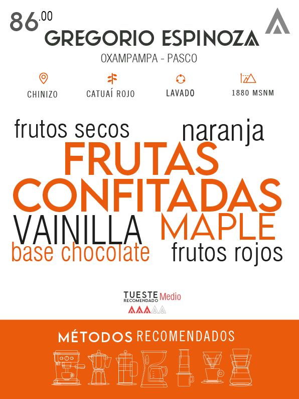 Descubre la elegancia y complejidad del café de Gregorio espinoza, cultivado en Chinizo - Oxapampa, Pasco, a 1880 msnm. Este microlote especial de la variedad catuaí rojo, con proceso lavado, resalta por su perfil sensorial excepcional.