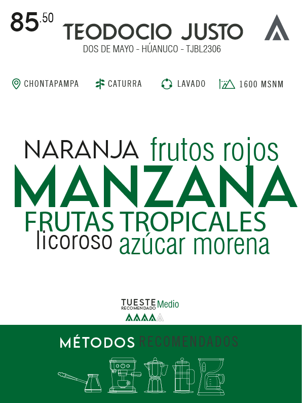 Descubre la elegancia y complejidad del café de Teodocio Justo, cultivado en Chontapampa, Dos de Mayo - Huanúco, a 1600 msnm. Este microlote especial de la variedad caturra, con proceso lavado, resalta por su perfil sensorial excepcional.
